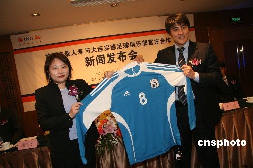 3月25日,在中超2008賽季開賽的前4天,大連實(shí)德足球俱樂(lè)部舉行新聞發(fā)布會(huì)?偨(jīng)理李明及主教練拉德科出席并正式宣告首創(chuàng)安泰人壽成為其官方合作伙伴。發(fā)布會(huì)上還展示了大連實(shí)德的中超2008賽季新隊(duì)衣。中新社發(fā) 大新 攝