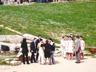 最激動人心的時刻即將來臨,最高女祭司娜芙普利都將在赫拉神廟的凹面鏡前點(diǎn)燃奧運(yùn)圣火。從古競技場到圣火采集地的赫拉神廟的路上,中間有一個通道,“禁地”前可謂戒備森嚴(yán),只有少數(shù)VIP貴賓才能進(jìn)入。這時,章子怡也想起身近距離觀看點(diǎn)火儀式,但在通道前被安保人員攔住。他們顯然沒弄清楚這位美女的身份,很疑惑地看著章子怡,身邊的2008北京奧運(yùn)官方電影工作人員則趕忙解釋:“super star”(超級巨星)。但胸前只是掛著記者證,并非VIP證的章子怡,盡管舉著證交涉了半天,還是被攔在了赫拉神廟之外。