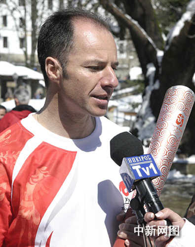 3月26日,北京奧運會圣火希臘境內(nèi)傳遞第三日,抵達冰雪覆蓋的山城邁措翁;鹁媸、希臘越野滑雪運動員尼克考斯期待自己能參加2010年溫哥華冬奧會。中新社記者 王歡