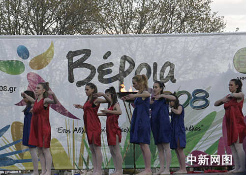 3月26日,北京奧運(yùn)會(huì)圣火希臘境內(nèi)傳遞第三日,抵達(dá)當(dāng)天最后一個(gè)城市韋里亞。慶典儀式上,演員身穿代表奧運(yùn)五環(huán)顏色的衣服翩翩起舞。中新社記者 王歡