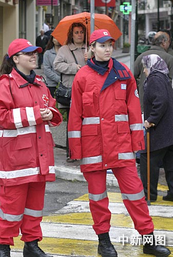 3月27日,北京奧運(yùn)圣火希臘境內(nèi)傳遞第四天,山城納烏薩迎來第一個慶典儀式。身穿紅制服的醫(yī)護(hù)人員在慶典儀式現(xiàn)場。中新社記者:王歡