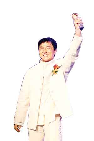 穿上唐裝的成龍?jiān)谂_(tái)上表示會(huì)繼續(xù)為國(guó)爭(zhēng)光。