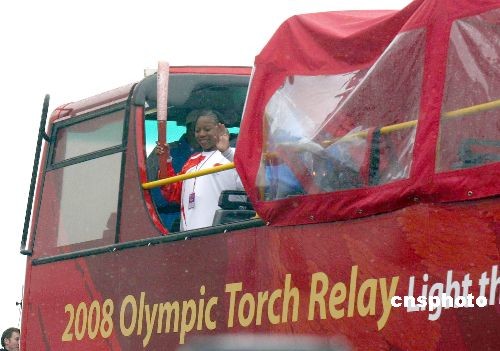4月6日上午10時(shí)32分,倫敦大雪紛飛,獲得過五枚奧運(yùn)金牌的英國劃艇名將史蒂夫·瑞格夫手持祥云火炬穩(wěn)步跑出倫敦西北的溫布利體育場,北京奧運(yùn)圣火傳遞“和諧之旅”第四站隨之吹響號(hào)角。倫敦是北京奧運(yùn)圣火境外傳遞過程中,傳遞路線最長、最復(fù)雜的城市。約八個(gè)半小時(shí)的圣火傳遞,包括了輪船、自行車、敞篷公共汽車、輕軌等四種特殊傳遞方式。圖為第二棒火炬手乘坐具有倫敦特色的紅色雙層巴士離開溫布利體育場。中新社發(fā) 沈晨 攝