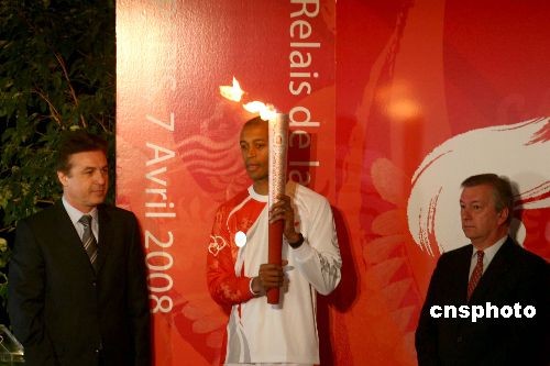 當(dāng)?shù)貢r(shí)間4月7日中午12時(shí)35分,北京奧運(yùn)圣火在“浪漫之都”巴黎傳遞在巴黎的地標(biāo)埃菲爾鐵塔拉開(kāi)帷幕。圖為第一個(gè)火炬手、法國(guó)田徑運(yùn)動(dòng)員史蒂芬·迪亞加納(中)在現(xiàn)場(chǎng)展示祥云火炬。中新社發(fā) 沈晨 攝
