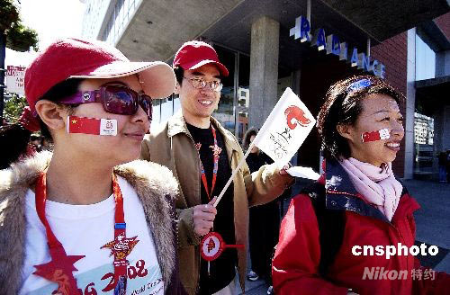 當(dāng)?shù)貢r間四月九日,北京奧運火炬在美國舊金山傳遞。兩名華人女青年為支持北京奧運,將自制的中國國旗和北京奧運標(biāo)志貼在臉上參加傳遞活動。陳鋼 攝