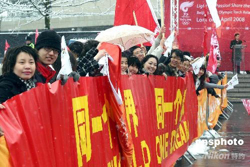 倫敦是北京奧運(yùn)圣火境外傳遞過(guò)程中,傳遞路線最長(zhǎng)、最復(fù)雜的城市。約八個(gè)半小時(shí)的圣火傳遞,包括了輪船、自行車(chē)、敞篷公共汽車(chē)、輕軌等四種特殊傳遞方式。圖為中國(guó)留學(xué)生在溫布利體育場(chǎng)外為奧運(yùn)圣火助威。 沈晨 攝