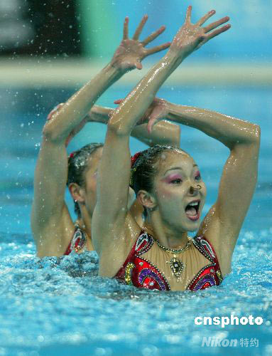 4月16日,“好運(yùn)北京”花樣游泳奧運(yùn)會(huì)資格賽在國家游泳中心拉開戰(zhàn)幕。在首日進(jìn)行的雙人技術(shù)自選的爭奪中,中國姐妹花蔣文文/蔣婷婷發(fā)揮出色,以95.500分位居第三。當(dāng)天兩位姐妹花的配樂是哈恰圖良的《馬刀舞曲》,這是姐妹倆第一次在正式比賽中使用該音樂,這首音樂也將伴隨著她們出現(xiàn)在北京奧運(yùn)會(huì)的舞臺(tái)上。中新社發(fā) 富田 攝
