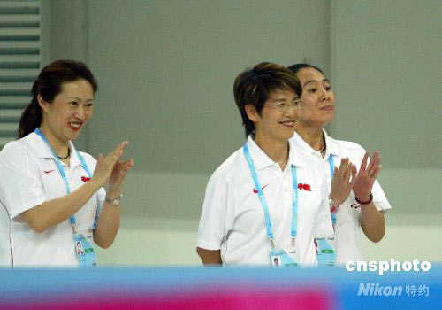 圖為中國(guó)花游日籍主教練井村雅代(中)及教練組成員在場(chǎng)邊為隊(duì)員的優(yōu)異表現(xiàn)喝彩。中新社發(fā) 富田 攝