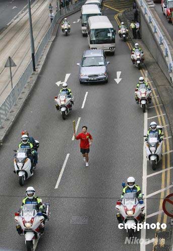 四月十八日,香港舉行北京奧運火炬接力測試,以確保五月二日的傳遞活動順利舉行。圖為模擬火炬手通過中環(huán)的中銀大廈前。中新社發(fā) 武仲林 攝