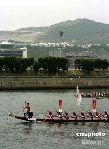 圖為一名火炬手乘坐龍舟橫渡城門河的情形。 譚達(dá)明 攝