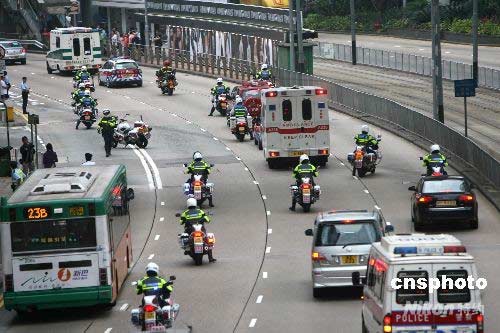 香港舉行北京奧運(yùn)火炬接力測試,以確保五月二日的傳遞活動順利舉行。包括救護(hù)、消防等多部門的火炬保障車隊陣容強(qiáng)大。武仲林 攝