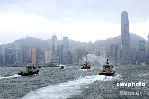 香港舉行北京奧運(yùn)火炬?zhèn)鬟f路線預(yù)演,維港海上數(shù)艘警用巡邏艇、快艇、護(hù)送火炬?zhèn)鬟f游輪過海,消防船在維港射水致意、飛機(jī)空中盤旋護(hù)駕。 王麗南 攝