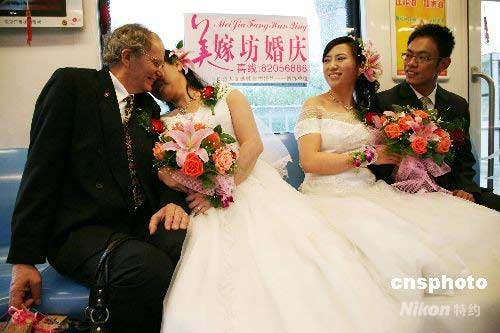 4月19日,新人們準備乘坐南京地鐵“婚車專列”。當(dāng)日,南京舉辦“幸福長城2008”地鐵集體婚禮,12對新人在行進中的南京地鐵“婚車專列”上喜結(jié)良緣,讓其他乘客一道共同感受甜蜜喜慶的氣氛,分享他們的幸福時光。中新社發(fā) 鐘山 攝