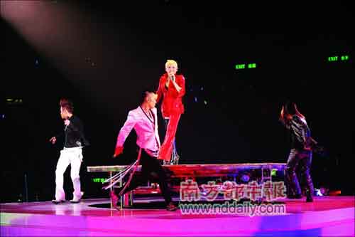當(dāng)晚,劉美君多年好友草蜢也為她登臺(tái)助興。草蜢三人的演唱會(huì)每次都因場(chǎng)面火辣,有性愛(ài)暗示而備受爭(zhēng)議。但前晚,3子雖然唱了兩首歌,但有劉美君的撩人在先,3人完全被比下去。