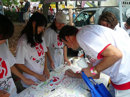 在現(xiàn)場擺設(shè)的“簽名支持北京奧運”攤位前,光臨這里的美國客人從開攤到收攤一直絡(luò)繹不絕。有許多美國朋友在聽留學(xué)生們講完關(guān)于“北京奧運對于中國人民的重大意義”, “北京奧運目前的籌備情況”等話題之后,當(dāng)即表示,我們完全支持你們的北京舉辦這屆奧運會,我們不同意任何人提出的“抵制北京奧運”的任何理由。有幾位曾經(jīng)到過北京的美國人對他們的同伴介紹說:我門去過北京的,那是一個既古老又新興的漂亮城市,在北京舉辦奧運會,絕對是本屆奧運會的最佳選擇! 他們都十分肯定地在由中國留學(xué)生準(zhǔn)備的簽名大橫幅上簽下了自己的名字。