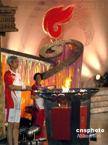 五月三日,最后一名火炬手、澳門立法會議員梁慶庭在漁人碼頭點燃北京奧運圣火盆,澳門奧運火炬接力圓滿結束。中新社發(fā) 史利 攝