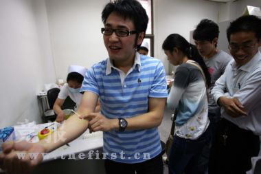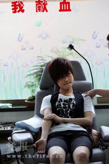何潔、黃雅莉是約好一起開車到血液中心的,并在車上填完獻(xiàn)血申請(qǐng)表?吹窖褐行木谷挥羞@么多人在獻(xiàn)血,她們也很激動(dòng),“不知道這么多人都會(huì)來啊,都是為災(zāi)區(qū),感覺很感動(dòng)!焙螡嵳f:“我以前在四川上學(xué),已經(jīng)問候了那邊的朋友,他們都很平安。今天是我第一次獻(xiàn)血,感覺還好吧!蓖瑏淼狞S雅莉雖然緊張,但還是很期待:“哎,不就是抽點(diǎn)血嘛,抽完了就好啦!痹诼犝f好朋友李宇春也來獻(xiàn)血時(shí),她們很關(guān)心:“春春暈血,她現(xiàn)在沒事吧。”不過在進(jìn)入驗(yàn)血室時(shí),剛剛還一副豁出去樣子的黃雅莉卻像孩子一樣跟公司的工作人員說:“其實(shí)我還是有點(diǎn)緊張哈!”但是她在何潔抽血時(shí),卻不停地給同伴鼓勵(lì):“何潔,別緊張,我支持你哦!”