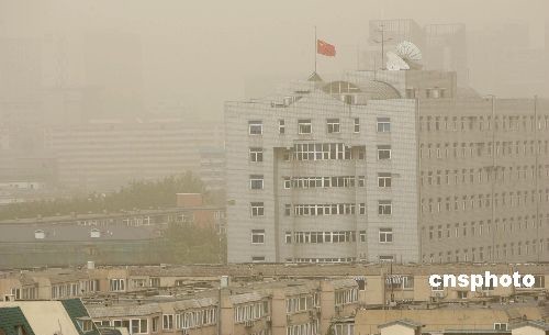 5月20日下午,北京出現(xiàn)沙塵天氣,黃色的浮塵籠罩全市。 中新社發(fā) 杜洋 攝