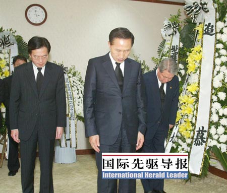 5月22日下午,一身深色西裝的李明博,臉色凝重,出現(xiàn)在中國(guó)駐韓國(guó)大使館設(shè)立的“5•12四川地震遇難者”吊唁堂內(nèi)。鞠躬默哀,敬獻(xiàn)花圈之后,李明博在吊唁簿上留言表示要與中國(guó)“共擔(dān)悲痛”,并強(qiáng)調(diào),“韓國(guó)將不遺余力地協(xié)助中國(guó)政府抗震救災(zāi)”。