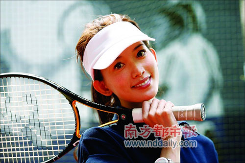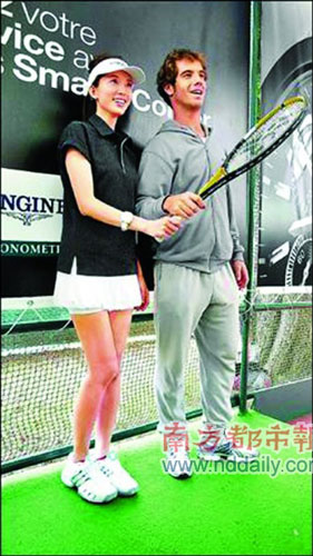 當(dāng)天,主辦單位安排現(xiàn)年19歲、目前法國(guó)排名第一的網(wǎng)球選手RichardGasquet教林志玲發(fā)球,“師徒”兩人剛見面,沒打過網(wǎng)球的林志玲就羞紅了臉。師傅教她握拍、開球,善打羽毛球的林志玲以羽毛球動(dòng)作開球,“花拳繡腿”地?fù)]拍接球,接連幾球都將球砸向攝影師,她俏皮地頻吐舌頭道歉。(祁玲)