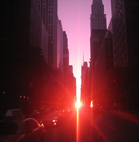 據(jù)悉,每年有兩天落日會(huì)對(duì)齊紐約曼哈頓主要的東西向街道,城市中高建筑會(huì)擋住落日,使曼哈頓看起來(lái)像是現(xiàn)代的巨石陣,整個(gè)紐約不夜城都沐浴在陽(yáng)光下。
