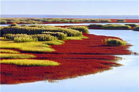 盤錦,地勢平坦,景觀獨(dú)特,資源豐富,可謂物華天寶,被稱作美麗、富饒的遼河金三角。距北京600多公里的遼寧盤錦有一片海灘,秋天一到,海邊的植物慢慢變紅,大片紅色鋪滿整個海灘,異常壯觀。