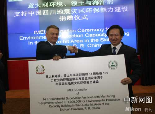 有關(guān)捐贈儀式11日在中國環(huán)境保護(hù)部舉行,中國環(huán)境保護(hù)部副部長李干杰出席了捐贈儀式。意大利環(huán)境、領(lǐng)土與海洋部環(huán)境研究與發(fā)展司司長克里尼代表意方將價值約100萬歐元震后急需的環(huán)境監(jiān)察用車及監(jiān)測設(shè)備捐贈給中國環(huán)境保護(hù)部。據(jù)悉,意大利環(huán)境、領(lǐng)土與海洋部是四川汶川地震后第一個向中國環(huán)境保護(hù)部提供抗震救災(zāi)環(huán)保專業(yè)設(shè)施援助的外國環(huán)保主管部門。