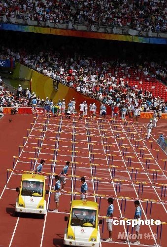 北京奧運(yùn)會(huì)田徑男子110米欄第一輪比賽,8月19日上午在北京奧林匹克公園內(nèi)的國(guó)家體育場(chǎng)舉行。中新社發(fā) 任晨鳴 攝