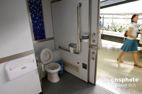 圖為2號(hào)航站樓01號(hào)遠(yuǎn)機(jī)位大棚加裝的臨時(shí)無(wú)障礙衛(wèi)生間。中新社發(fā) 杜洋 攝