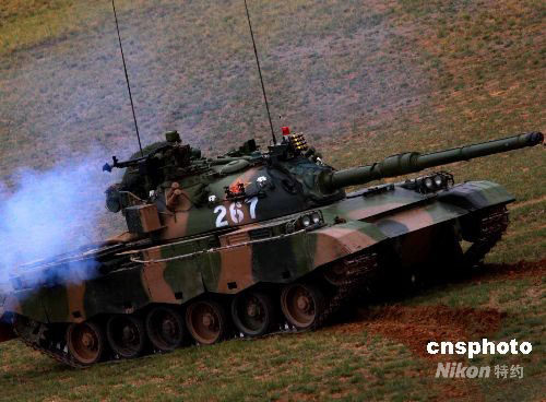 參加“礪兵--2008”演習(xí)的中國人民解放軍部隊(duì),9月22日在北方某地進(jìn)行紅、藍(lán)軍聯(lián)合演練。參演雙方主力分別是濟(jì)南軍區(qū)某機(jī)械化步兵旅和北京軍區(qū)某裝甲團(tuán)!八{(lán)方A作戰(zhàn)集團(tuán)”主力北京軍區(qū)裝甲團(tuán),是一支裝備新型坦克,在全軍率先完成主戰(zhàn)裝備的信息化改造,具備復(fù)雜電磁環(huán)境下作戰(zhàn)能力的裝甲勁旅。“紅方B作戰(zhàn)集團(tuán)”以濟(jì)南軍區(qū)機(jī)步旅為主,加強(qiáng)陸航空降兵兵力。解放軍新型主戰(zhàn)坦克亮相。中新社發(fā) 宋吉河 攝