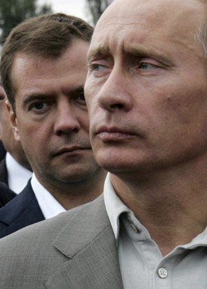 普京(前)直言決策權(quán)在梅德韋杰夫(后)手中。