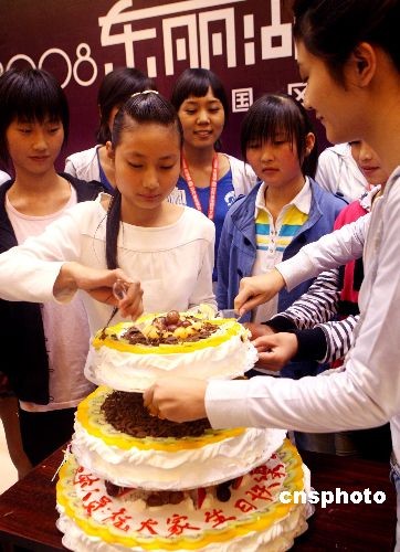 圖為在天津上學(xué)的甘肅地震災(zāi)區(qū)學(xué)生與參賽佳麗一起慶賀生日。中新社發(fā) 錢興強 攝