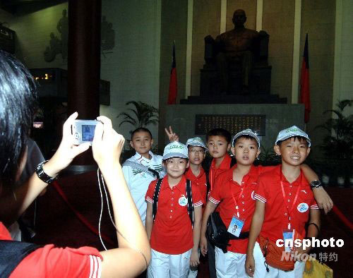 福建小營員前往臺北孫中山紀念館參觀并在孫中山塑像前留影。中新社發(fā) 劉可耕 攝