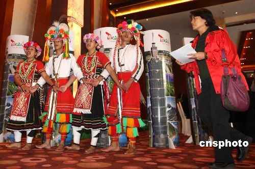 圖為來自臺灣的原住民在會(huì)場外載歌載舞歡迎賓客。