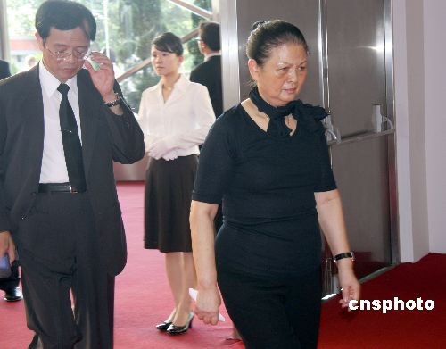 臺塑企業(yè)創(chuàng)辦人王永慶的遺體十七日由長榮班機運抵臺灣,靈堂設(shè)在桃園縣的長庚大學活動中心。圖為王永慶的夫人李寶珠步入靈堂。中新社發(fā) 耿軍 攝