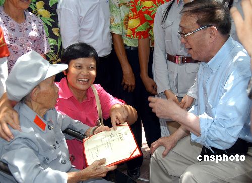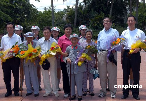 2007年6月26日,著名導演謝晉和演員牛犇代表劇組向紅色娘子軍老戰(zhàn)士王運梅、陳振梅贈送慰問金、獎章和證書。為慶祝中國人民解放軍建軍80周年,中央電視臺15集大型系列片《祖國不會忘記》劇組專程來到紅色娘子軍的故鄉(xiāng)海南瓊海市攝制有關(guān)專題。當天中午,曾執(zhí)導故事片《紅色娘子軍》的著名導演謝晉和該片演員牛犇隨劇組來到紅色娘子軍紀念園再會娘子軍老戰(zhàn)士。中新社發(fā) 蒙鐘德 攝