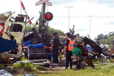 目擊者說,那輛巴士在凌晨兩點多行經(jīng)平交道的時候,不顧警告訊號和已經(jīng)放下的柵欄企圖硬闖,結(jié)果被火車撞成兩截,殘骸躺在鐵軌邊,行李箱、衣服和脫落扭曲的巴士座椅散落在鐵軌邊,火車也部份出軌。