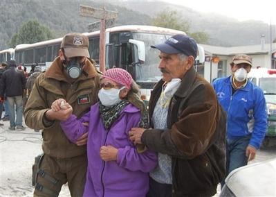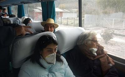 智利當(dāng)?shù)貢r間6日,柴騰火山附近的村民帶著防護口罩開始撤離。