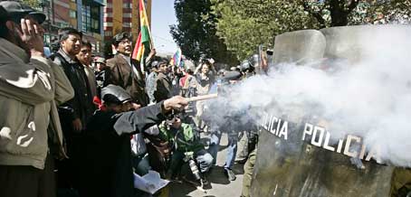 示威群眾向使館扔石塊和鞭炮,要求降下使館的旗子。警察發(fā)射催淚彈和水槍,運(yùn)用防暴警車,與示威者發(fā)生沖突。至少有1名警察和2名示威者受傷。埃拉爾多的一位市議員說,“因?yàn)榫斓逆?zhèn)壓暴力我們失去了一場(chǎng)戰(zhàn)斗,但是明天或某一天我們還會(huì)再來燒使館”。警察用防暴車擋住使館的主要入口。示威者高呼“正義,正義”的口號(hào),曾沖破警戒線,威脅要燒使館的大樓。前國(guó)防部長(zhǎng)曾卷入2003年10月造成67人死亡和400人受傷的事件,那次事件以后當(dāng)時(shí)的德拉索達(dá)總統(tǒng)被迫辭職。民意測(cè)驗(yàn)表明,莫拉萊斯總統(tǒng)在埃拉爾托市的民眾支持率高達(dá)70%.(管彥忠)