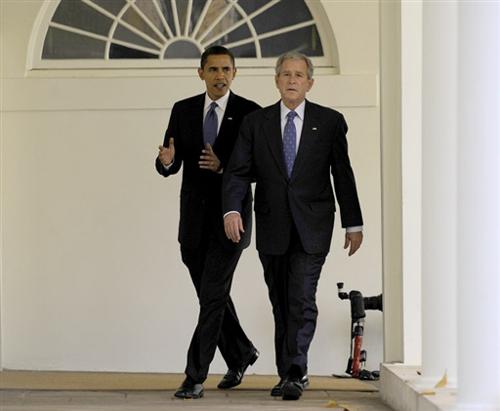 布什與奧巴馬進(jìn)入橢圓形辦公室