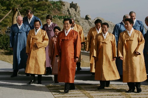 資料圖片:2005年11月19日,國家主席胡錦濤出席亞太經(jīng)合組織第十三次領(lǐng)導(dǎo)人非正式會(huì)議。圖為胡錦濤主席等亞太經(jīng)合組織成員的領(lǐng)導(dǎo)人身著韓國民族特色的服裝“圖魯馬吉”合影后,前往出席《亞太經(jīng)濟(jì)合作組織第十三次領(lǐng)導(dǎo)人非正式會(huì)議釜山宣言》的宣讀儀式。樊如鈞 攝