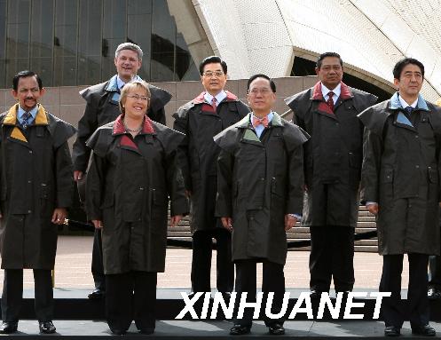 2007年9月8日,亞太經(jīng)濟(jì)合作組織第十五次領(lǐng)導(dǎo)人非正式會(huì)議第一階段會(huì)議開始前,各成員領(lǐng)導(dǎo)人身著澳大利亞特色服裝在悉尼歌劇院合影。新華社記者黃敬文攝