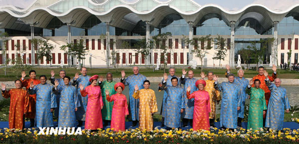2006年11月19日,亞太經(jīng)合組織各成員領(lǐng)導(dǎo)人身穿越式傳統(tǒng)服裝,集體在越南首都河內(nèi)國家會(huì)議中心西島合影留念。 新華社記者 樊如鈞 攝