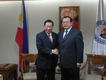 劉大使表示,加強(qiáng)中菲友好合作符合兩國(guó)利益,有利于本地區(qū)和平與發(fā)展。他提議:兩國(guó)應(yīng)進(jìn)一步加強(qiáng)相互了解,增進(jìn)政治互信;加強(qiáng)經(jīng)貿(mào)往來,中方愿積極參與菲民生和基礎(chǔ)設(shè)施等項(xiàng)目;加強(qiáng)在地區(qū)和國(guó)際事務(wù)中的合作,共同應(yīng)對(duì)國(guó)際金融危機(jī);加強(qiáng)文教、旅游合作及民間交往。劉大使介紹了當(dāng)前兩岸和平發(fā)展的新形勢(shì),望菲方繼續(xù)堅(jiān)持一個(gè)中國(guó)政策。羅慕洛外長(zhǎng)贊同劉大使所談并表示,菲方高度重視對(duì)華關(guān)系,阿羅約總統(tǒng)去年就3度訪華。世界、東盟、菲律賓得益于中國(guó)的快速發(fā)展。他表示,臺(tái)灣問題是中國(guó)內(nèi)政,菲方將繼續(xù)堅(jiān)定奉行一個(gè)中國(guó)政策。