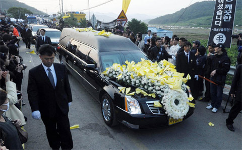 有關人員捧著牌位和無窮花大勛章出來,隨后盧武鉉前總統(tǒng)的棺柩經(jīng)過峰下村,運至黑色凱迪拉克,現(xiàn)場傳出哀戚嗚咽的哭聲。