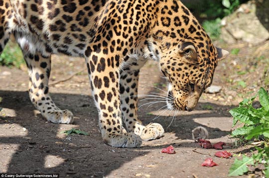 英國(guó)媒體5日刊出了一組照片,照片中的小老鼠看來(lái)只有兩三個(gè)月大,在動(dòng)物園的喂食時(shí)間稍過(guò)不久,便見(jiàn)它蹦蹦跳跳的溜進(jìn)了豹子的地盤。來(lái)干嘛?呵呵,偷點(diǎn)小點(diǎn)心嘗嘗唄!