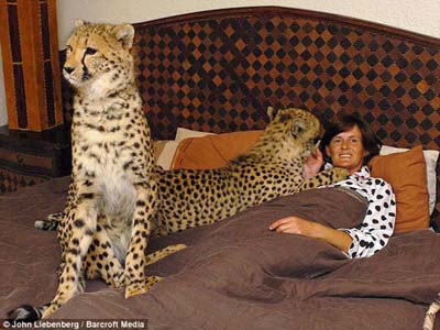 中新網(wǎng)7月3日電 據(jù)英國媒體報(bào)道,南非一名46歲女子在家中養(yǎng)了4只印度豹、5只獅子和2只老虎,她與它們同吃同住親密無間,甚至晚上睡覺時(shí)也同這些伙伴躺在一張床上。
