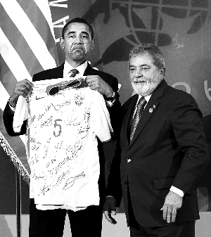 美國(guó)總統(tǒng)貝拉克·奧巴馬9日和巴西總統(tǒng)盧拉·達(dá)席爾瓦會(huì)面時(shí),雙方大談足球經(jīng),盧拉還送給奧巴馬一件巴西國(guó)家男子足球隊(duì)成員簽名的球衣。