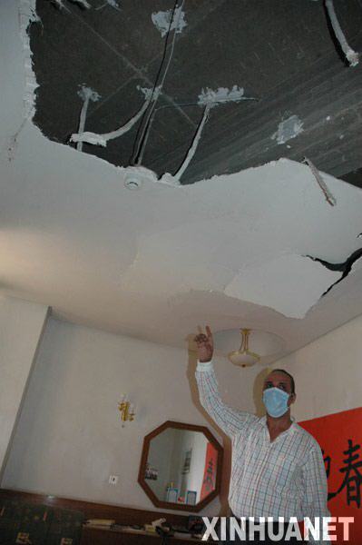 就在拿到相機(jī)轉(zhuǎn)身的一瞬間,第二聲巨響響起,整個(gè)大樓劇烈顫抖起來(lái),陽(yáng)臺(tái)的玻璃門(mén)爆裂,無(wú)數(shù)的碎玻璃打在記者剛離開(kāi)的辦公桌前。陽(yáng)臺(tái)上的衛(wèi)星電話、辦公桌上的英文字典和地上的垃圾桶被氣浪掀飛起來(lái),記者也被氣浪掀倒在沙發(fā)后。鋁合金門(mén)框整個(gè)砸到墻上。記者的頭頂碎石亂飛,天花板出現(xiàn)了3個(gè)大窟窿,落下的天花板砸在記者床上。樓道里傳來(lái)其他房間的天花板和門(mén)窗倒塌之聲,嗆人的煙霧充滿整個(gè)樓道。
