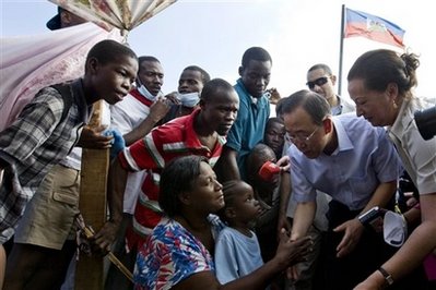 聯(lián)合國秘書長潘基文一行17日在海地了解地震造成的損失并掌握了第一手的災(zāi)情資料。面對(duì)嚴(yán)峻的救援情況,日漸絕望的海地災(zāi)民,在被問到是否有足夠的救援物資滿足數(shù)以百萬計(jì)的災(zāi)民時(shí),潘基文說:“我真心希望并呼吁海地人民要更加耐心”,他還表示不希望看到發(fā)生騷亂。